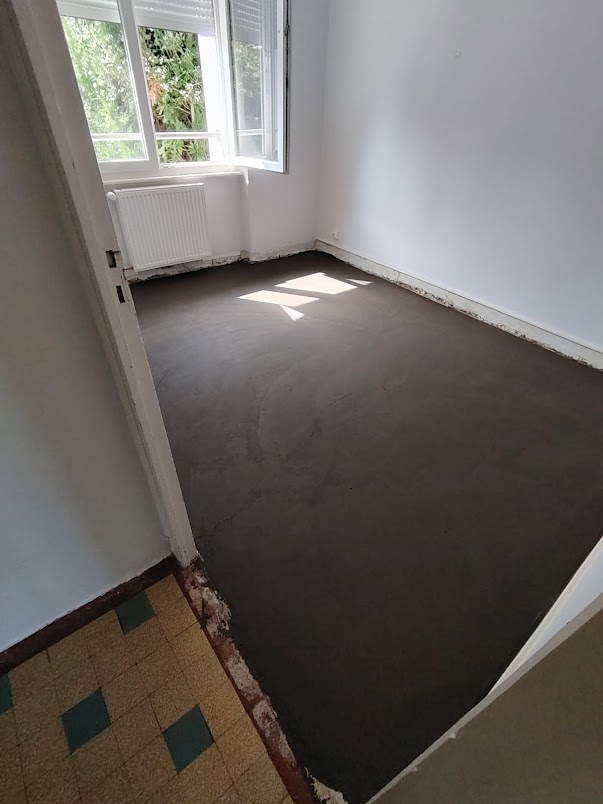 Ponçage parquet chêne et pose ragréage sur carrelage avant pose…