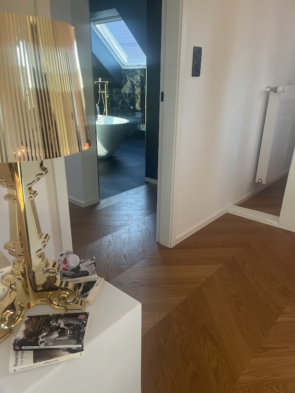 La base de ce projet repose sur la qualité exceptionnelle des bois fournis par Natura Parquets. Ce fabricant a sélectionné un chêne de premier choix pour façonner les lames du Point de Hongrie, garantissant une stabilité parfaite et un veinage harmonieux, idéal pour recevoir la finition dorée souhaitée.